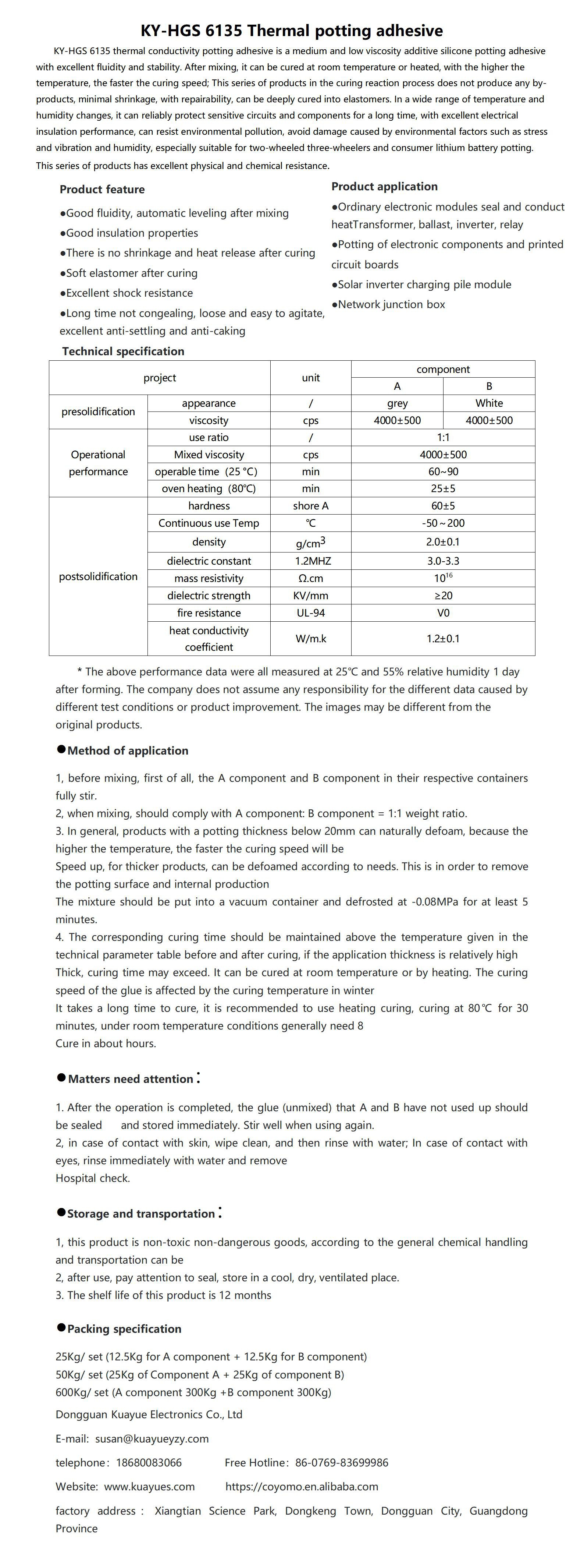 KY-HGS 6135 thermal conductivity potting adhesive is a medium and low viscosity additive silicone potting adhesive with excellent fluidity and stability. After mixing, it can be cured at room temperature or heated, with the higher the temperature, the faster the curing speed; This series of products in the curing reaction process does not produce any by-products, minimal shrinkage, with repairability, can be deeply cured into elastomers. In a wide range of temperature and humidity changes, it can reliably protect sensitive circuits and components for a long time, with excellent electrical insulation performance, can resist environmental pollution, avoid damage caused by environmental factors such as stress and vibration and humidity, especially suitable for two-wheeled three-wheelers and consumer lithium battery potting. This series of products has excellent physical and chemical resistance.