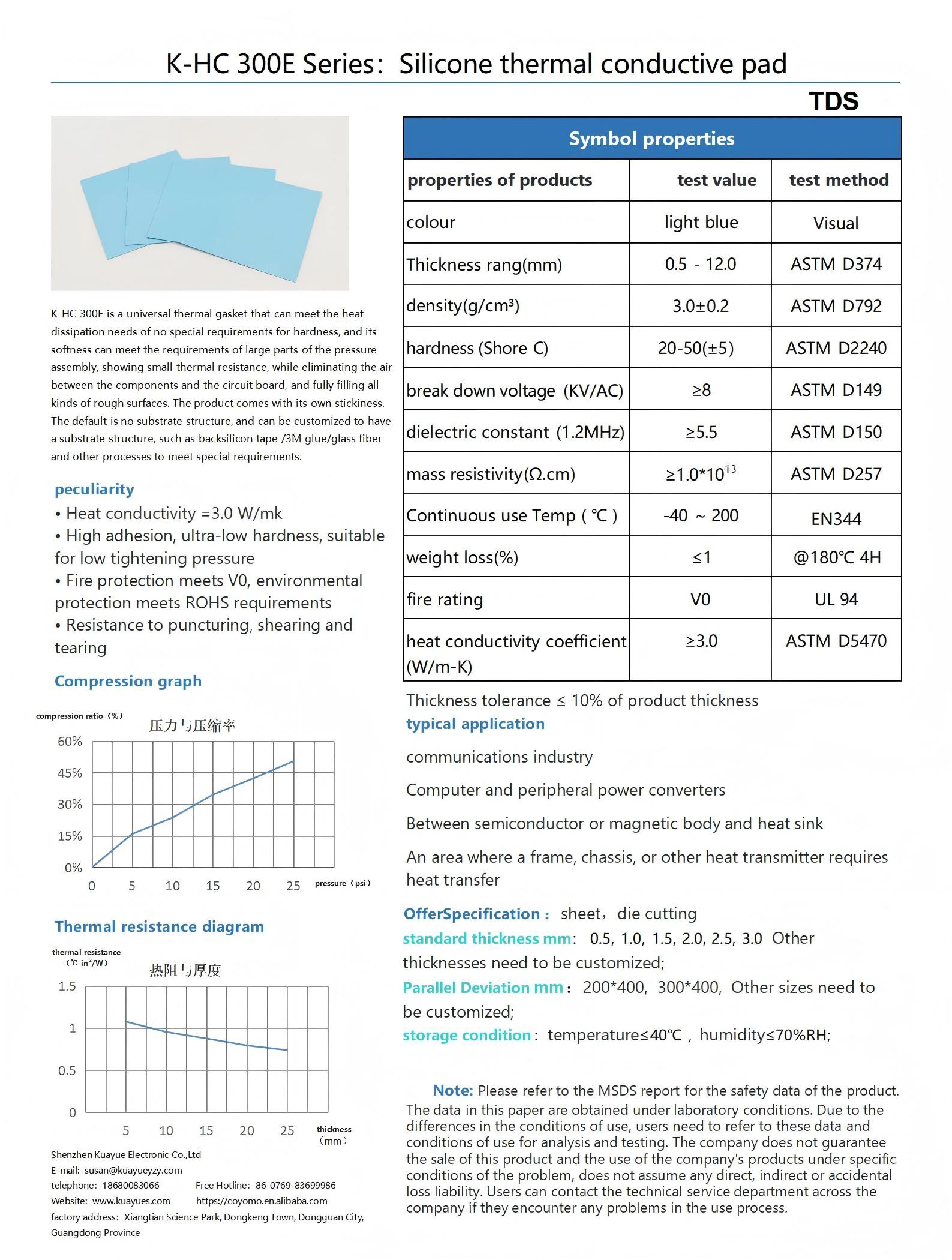 K-HC 300E is a universal thermal gasket that can meet the heat dissipation needs of no special requirements for hardness, and its softness can meet the requirements of large parts of the pressure assembly, showing small thermal resistance, while eliminating the air between the components and the circuit board, and fully filling all kinds of rough surfaces. The product comes with its own stickiness. The default is no substrate structure, and can be customized to have a substrate structure, such as backsilicon tape /3M glue/glass fiber and other processes to meet special requirements.