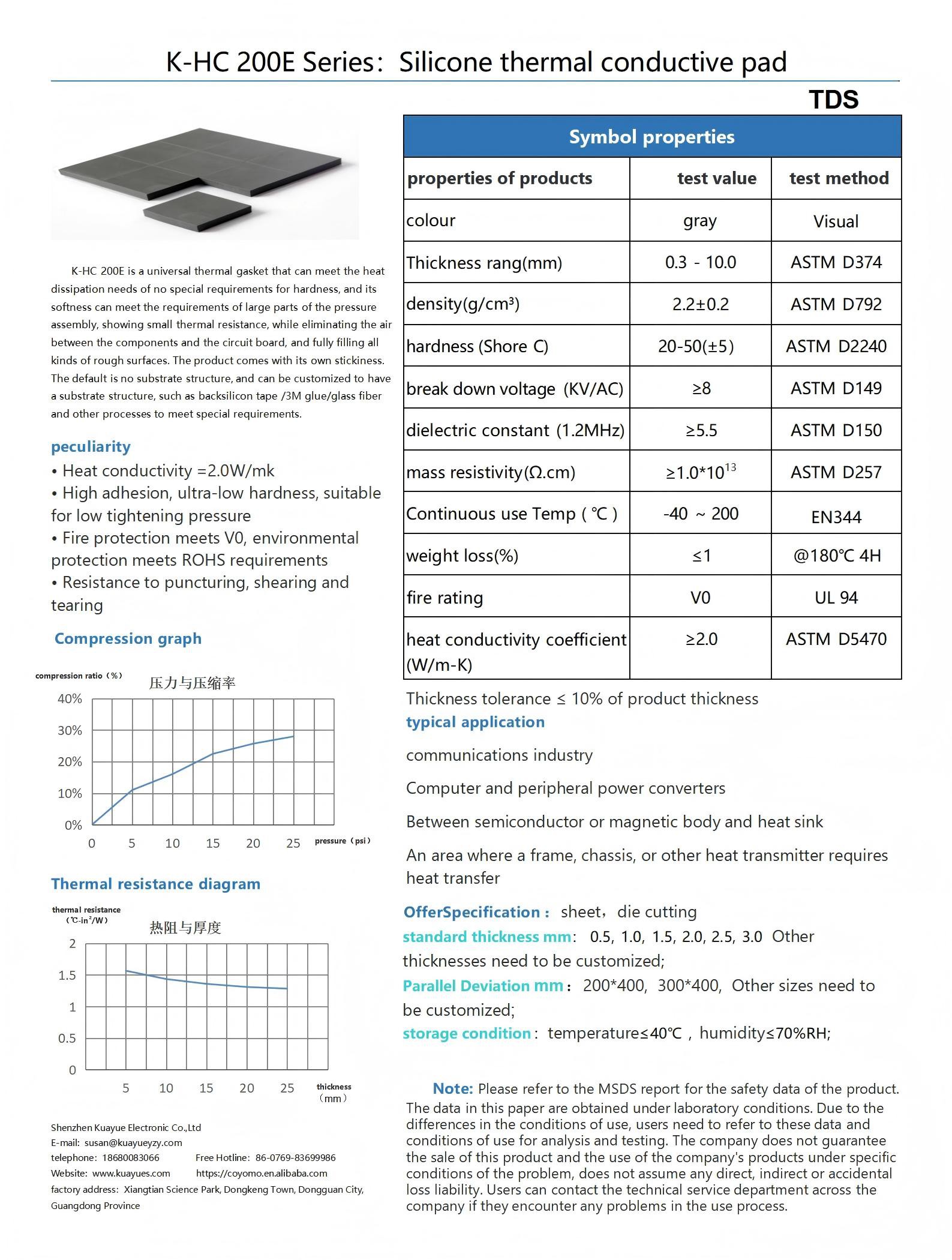 K-HC 200E is a universal thermal gasket that can meet the heat dissipation needs of no special requirements for hardness, and its softness can meet the requirements of large parts of the pressure assembly, showing small thermal resistance, while eliminating the air between the components and the circuit board, and fully filling all kinds of rough surfaces. The product comes with its own stickiness. The default is no substrate structure, and can be customized to have a substrate structure, such as backsilicon tape /3M glue/glass fiber and other processes to meet special requirements.