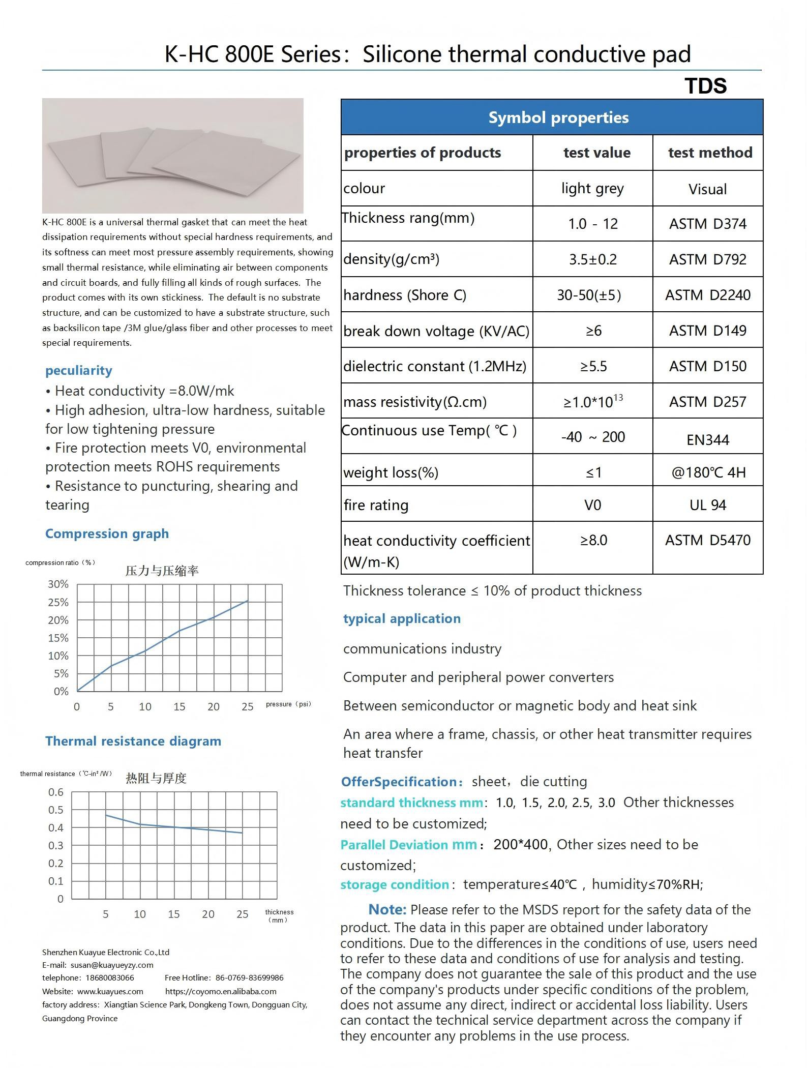 K-HC 800E is a universal thermal gasket that can meet the heat dissipation requirements without special hardness requirements, and its softness can meet most pressure assembly requirements, showing small thermal resistance, while eliminating air between components and circuit boards, and fully filling all kinds of rough surfaces. The product comes with its own stickiness. The default is no substrate structure, and can be customized to have a substrate structure, such as backsilicon tape /3M glue/glass fiber and other processes to meet special requirements.