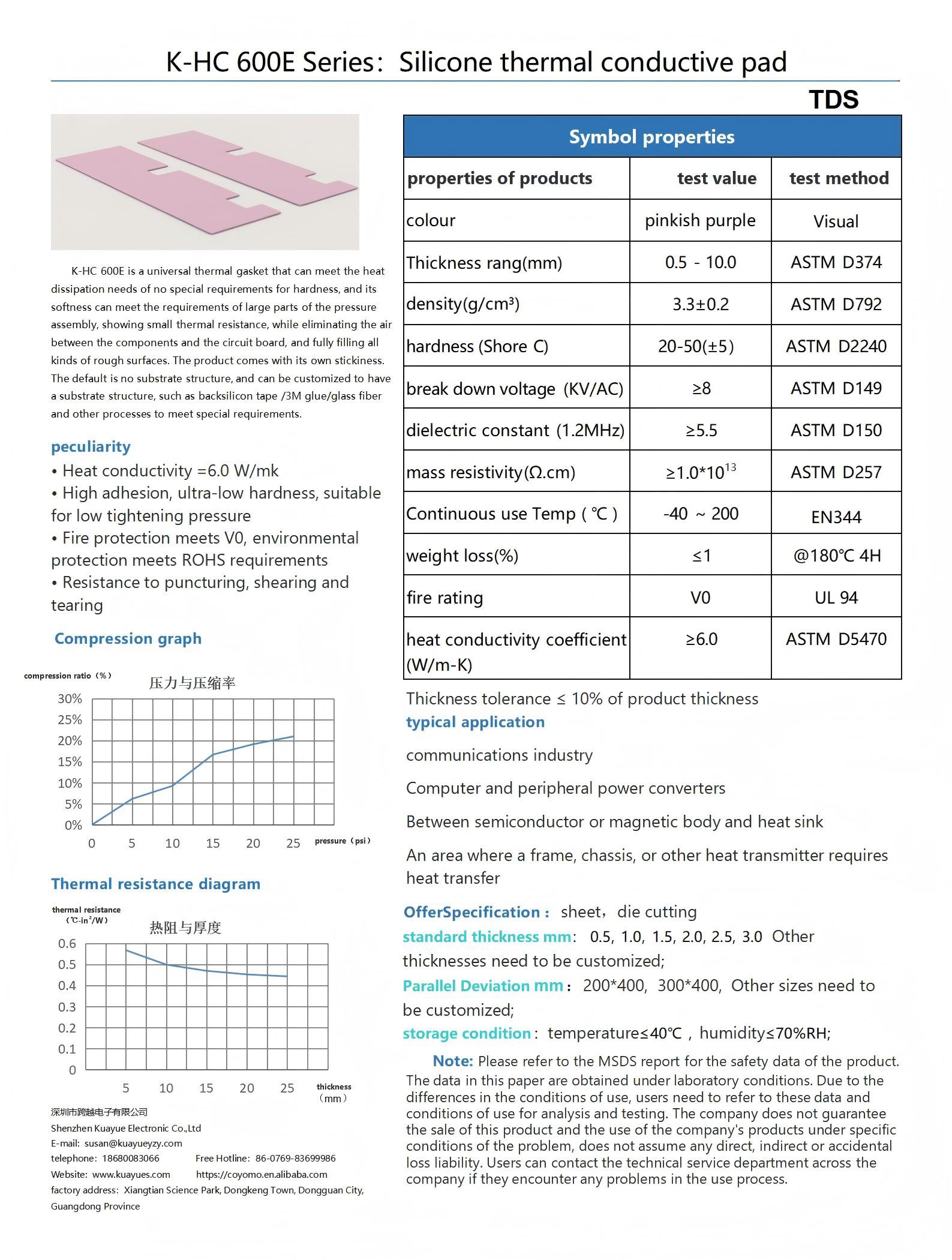 K-HC 600E is a universal thermal gasket that can meet the heat dissipation needs of no special requirements for hardness, and its softness can meet the requirements of large parts of the pressure assembly, showing small thermal resistance, while eliminating the air between the components and the circuit board, and fully filling all kinds of rough surfaces. The product comes with its own stickiness. The default is no substrate structure, and can be customized to have a substrate structure, such as backsilicon tape /3M glue/glass fiber and other processes to meet special requirements.