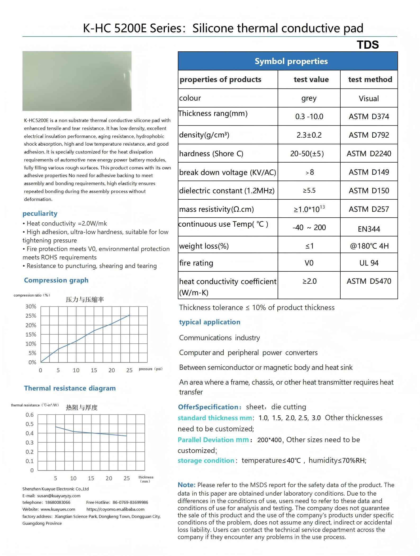 K-HC5200E is a non substrate thermal conductive silicone pad with enhanced tensile and tear resistance. It has low density, excellent electrical insulation performance, aging resistance, hydrophobic shock absorption, high and low temperature resistance, and good adhesion. It is specially customized for the heat dissipation requirements of automotive new energy power battery modules, fully filling various rough surfaces. This product comes with adhesive properties. No need for adhesive backing to meet assembly and bonding requirements, high elasticity ensures repeated bonding during the assembly process without deformation.