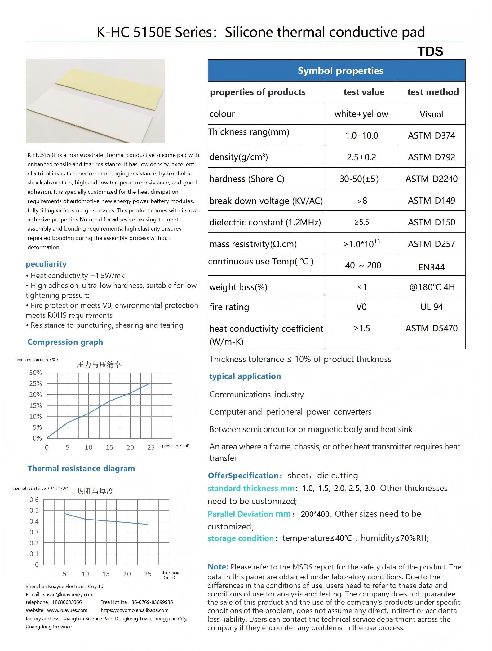 K-HC5150E is a non substrate thermal conductive silicone pad with enhanced tensile and tear resistance. It has low density, excellent electrical insulation performance, aging resistance, hydrophobic shock absorption, high and low temperature resistance, and good adhesion. It is specially customized for the heat dissipation requirements of automotive new energy power battery modules, fully filling various rough surfaces. This product comes with its own adhesive properties No need for adhesive backing to meet assembly and bonding requirements, high elasticity ensures repeated bonding during the assembly process without deformation.