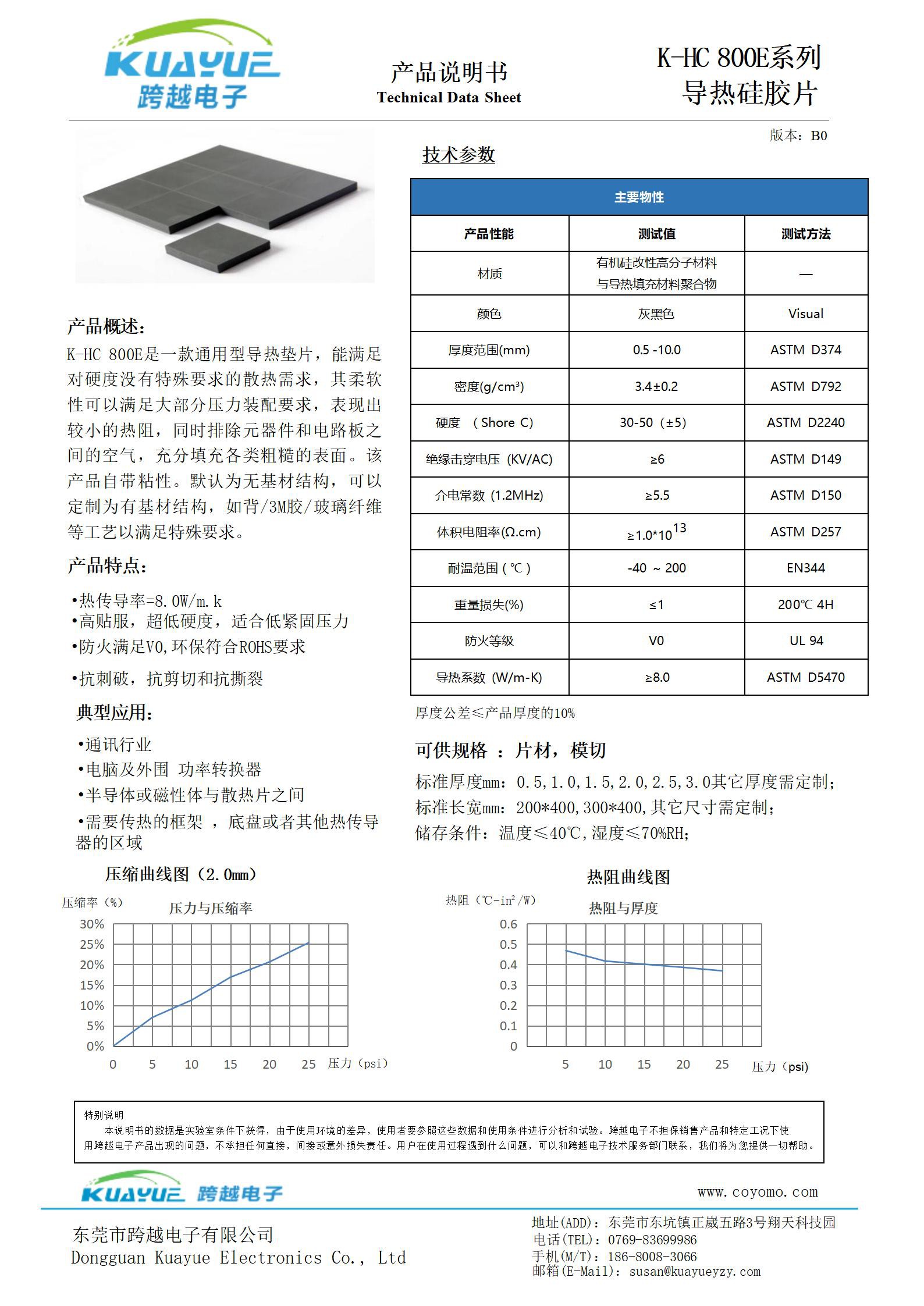 K-HC 800E是一款通用型导热垫片,能满足对硬度没有特殊要求的散热需求,其柔软性可以满足大部分压力装配要求,表现出较小的热阻,同时排除元器件和电路板之间的空气,充分填充各类粗糙的表面。该产品自带粘性。默认为无基材结构,可以定制为有基材结构,如背/3M胶/玻璃纤维等工艺以满足特殊要求。