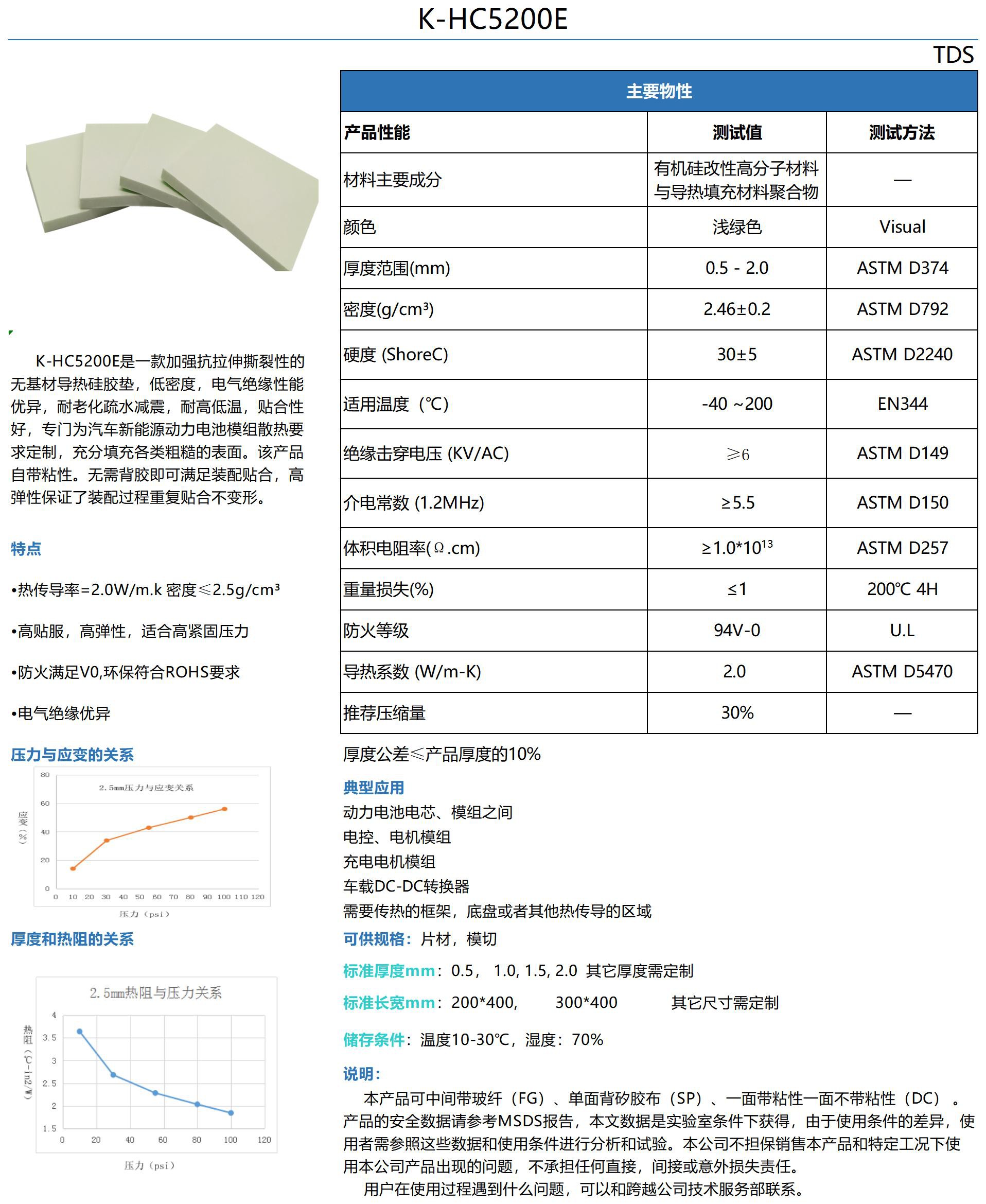 K-HC5200E是一款加强抗拉伸撕裂性的无基材导热硅胶垫,低密度,电气绝缘性能优异,耐老化疏水减震,耐高低温,贴合性好,专门为汽车新能源动力电池模组散热要求定制,充分填充各类粗糙的表面。该产品自带粘性。无需背胶即可满足装配贴合,高弹性保证了装配过程重复贴合不变形。